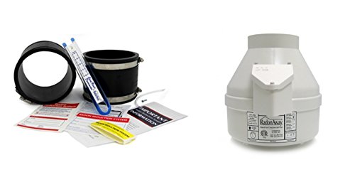 RadonAway GP501 Radon Fan & install kit: two 3″x3″ black Couplings & U-tube vacuum gauge & radon system labels